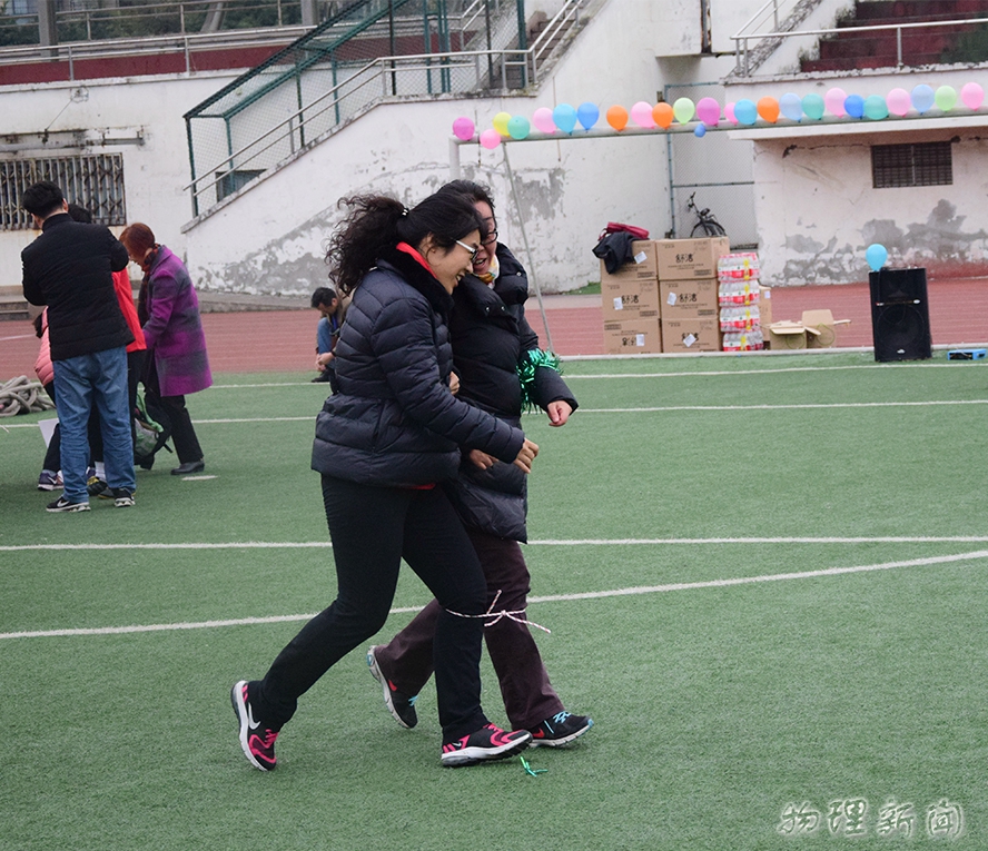 第一个项目是二人三足跑,在这个家喻户晓的有趣游戏中老师们也玩得十分尽兴。虽然大家因为被绑着腿而行走困难,但是那僵硬逗趣的走路姿势与左摇右摆的身体还是惹得自己都不由得大笑起来。在一旁还没有开始比赛的老师们则大叫着“不要摔着了……”。可不曾想,还没有说完自己便先哈哈大笑了起来。此起彼伏的欢快笑声让体育场上的氛围变得轻松愉快起来。紧接其后的“螃蟹背西瓜”让体育场上的欢快气氛更进一层。老师们三人一组,背对着背,手环着手,用背部夹住气球共同前进。听着似乎很简单,但看着众“运动员”们“蹒跚”前进的步伐便知道这个项目很考验团队合作。为了加快速度,各组队员们各出奇招。一组队员中的两位男老师甚至直接一人一手提起了另一位女老师,这种逗趣的合作方式惹得场上的人们纷纷点赞,忍俊不禁。