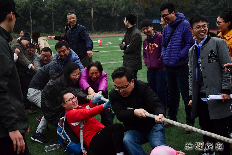 当然,最有趣的项目还是压轴的“趣味拔河”。老师与学生一起合作分为四队,进行初赛和决赛。一开始的挑选学生环节可就有技术含量了,老师们“煞有其事”地分析出要挑选高大强壮的学生,为了选到高大强壮的队员,老师们都使尽了浑身解数。比赛一开始,双方便大喊着给自己加油助威,大家也都全神贯注地盯着拔河绳的最中间,期待着自己看好的队伍会赢得胜利。而最后,大受看好的机关教工队果然成功拿下拔河冠军,欢呼着庆祝这份团队合作才得来的胜利。