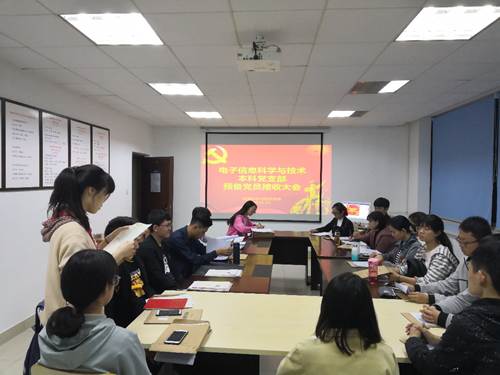 为响应学院党委关于加强威尼斯欢乐娱人城1099基层党支部建设的号召,10月11日晚上19:00,电子信息科学与技术本科党支部在X5527召开支部预备党员接收大会。支部书记梁含笑同志、宣传委员杨宁同志、组织委员钟荣良同志、各预备党员与党员发展对象参加了本次会议。会议由支部书记梁含笑同志主持,本次会议应到党员7人,实到5人,符合有关规定可召开接收大会。