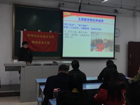 接下来,支部书记王辉同志代表物理系教工党支部述职,她从五个方面向全体党员同志进行了汇报:支部基本情况、支部履行党建职责情况、支部建设情况和成效、工作中存在的不足(问题清单)以及展望。她特别提到:2019年物理系全面深入学习贯彻习近平新时代中国特色社会主义思想和习近平总书记关于教育的重要论述,全面贯彻党的教育方针,坚持立德树人根本任务。在思想政治工作的引领下,充分发挥党员的先锋模范作用,2019年物理系有力推进了课程思政建设和“双万”课程国家一流课程建设。最后,王辉同志代表支部列出了支部的问题清单及整改方案,如支部理论学习形式过于单一、学习成效不显著;党员之间、党员和群众之间交流不深入;对党员的监督管理不够有力等。