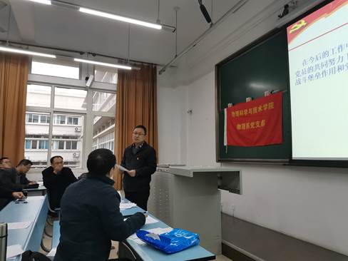 2019年12月5日下午,根据习近平总书记关于“不忘初心、牢记使命”主题教育重要讲话和重要指示批示精神,按照中央“不忘初心、牢记使命”主题教育领导小组印发《关于第二批主题教育单位基层党组织召开专题组织生活会和开展民主评议党员的通知》要求,结合学校党委和学院党委的工作部署,威尼斯欢乐娱人城1099物理系教工党支部在犀浦校区X2430召开“不忘初心、牢记使命”专题组织生活会和民主评议党员。活动由支部副书记朱浩同志主持,学院党委书记刘玉同志列席会议,全体党员同志(含峨眉校区党员)出席。
